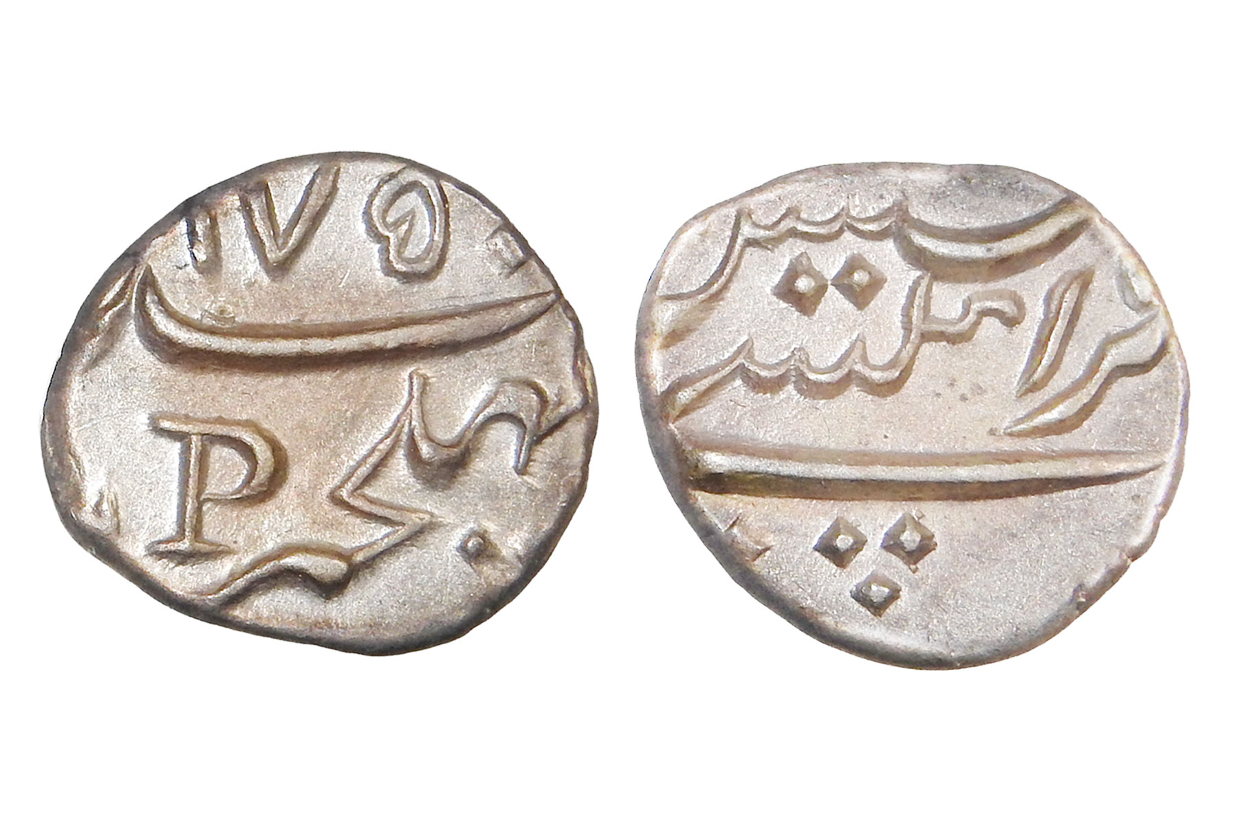 French India, Silver Fanon a.k.a 1/5th rupee, 2.30grms, Mahe Issue, AD1750, Minted at Pondicherry, with letter "P", Very Fine+