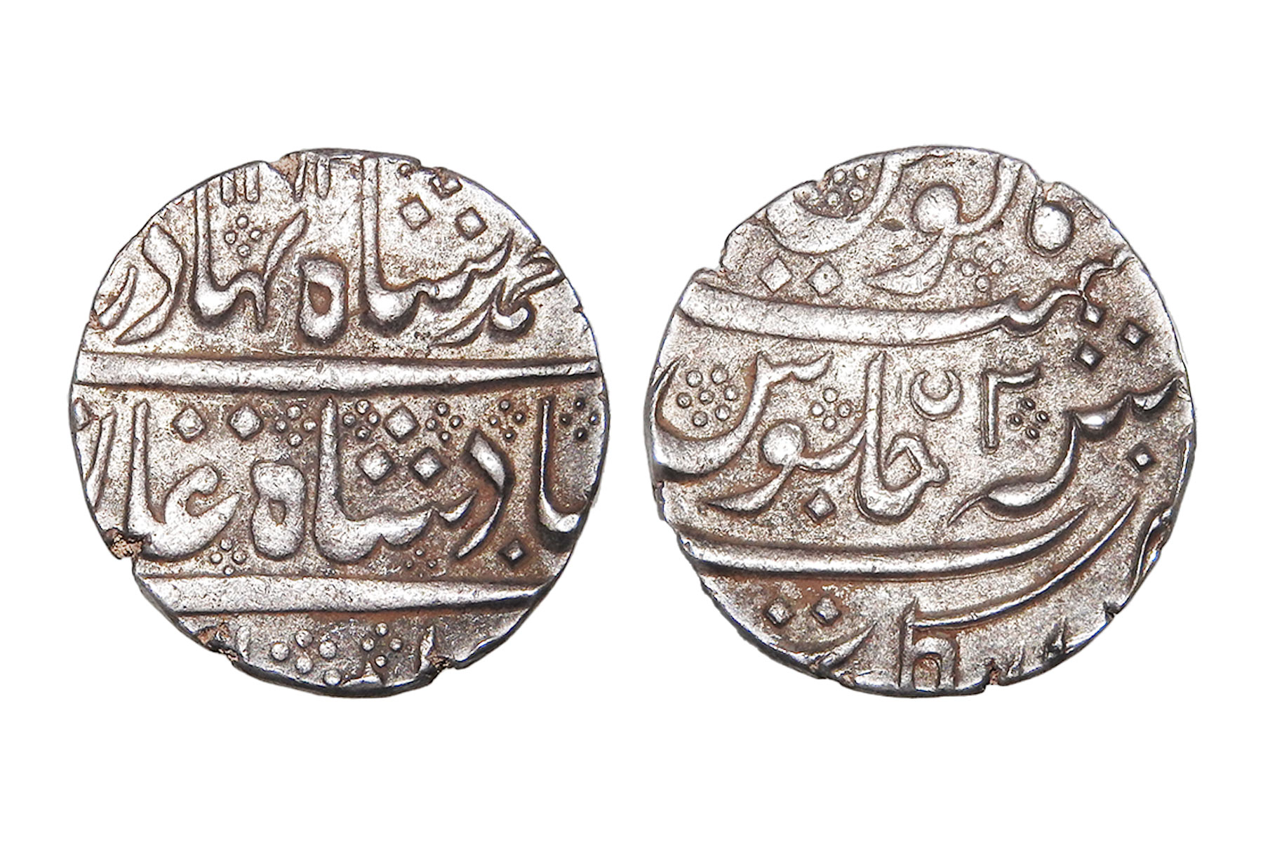 French India, In the name of Mughal king- Ahmed Shah Bahadur, Silver Rupee, 11.40grms, AH1162/RY02, Minted at Arkat, Extra Fine+, Rare with date visible