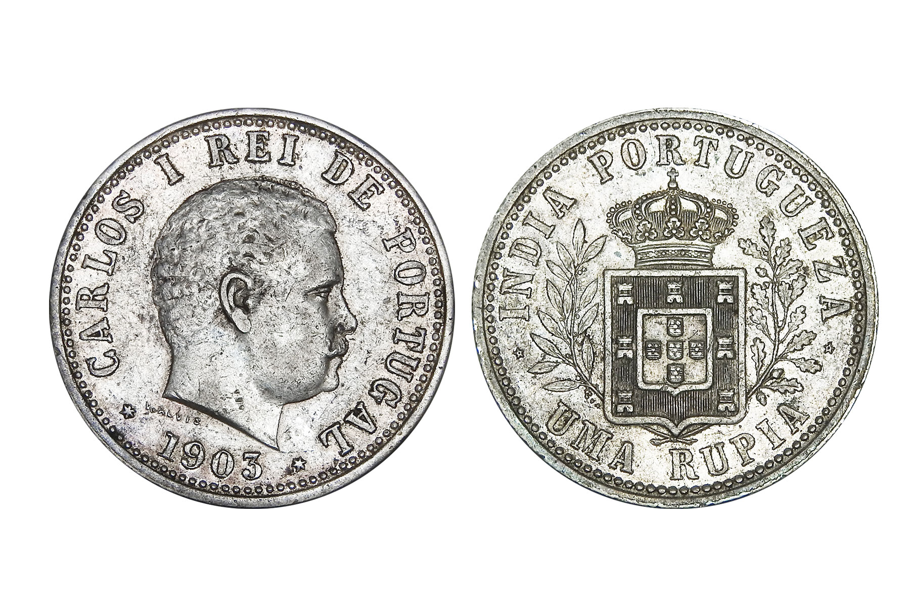 Portuguese India, Carlos I(c. 1903CE), Silver Uma Rupia, 11.60grms, Uncleaned, Extra Fine+, Rare in this condition