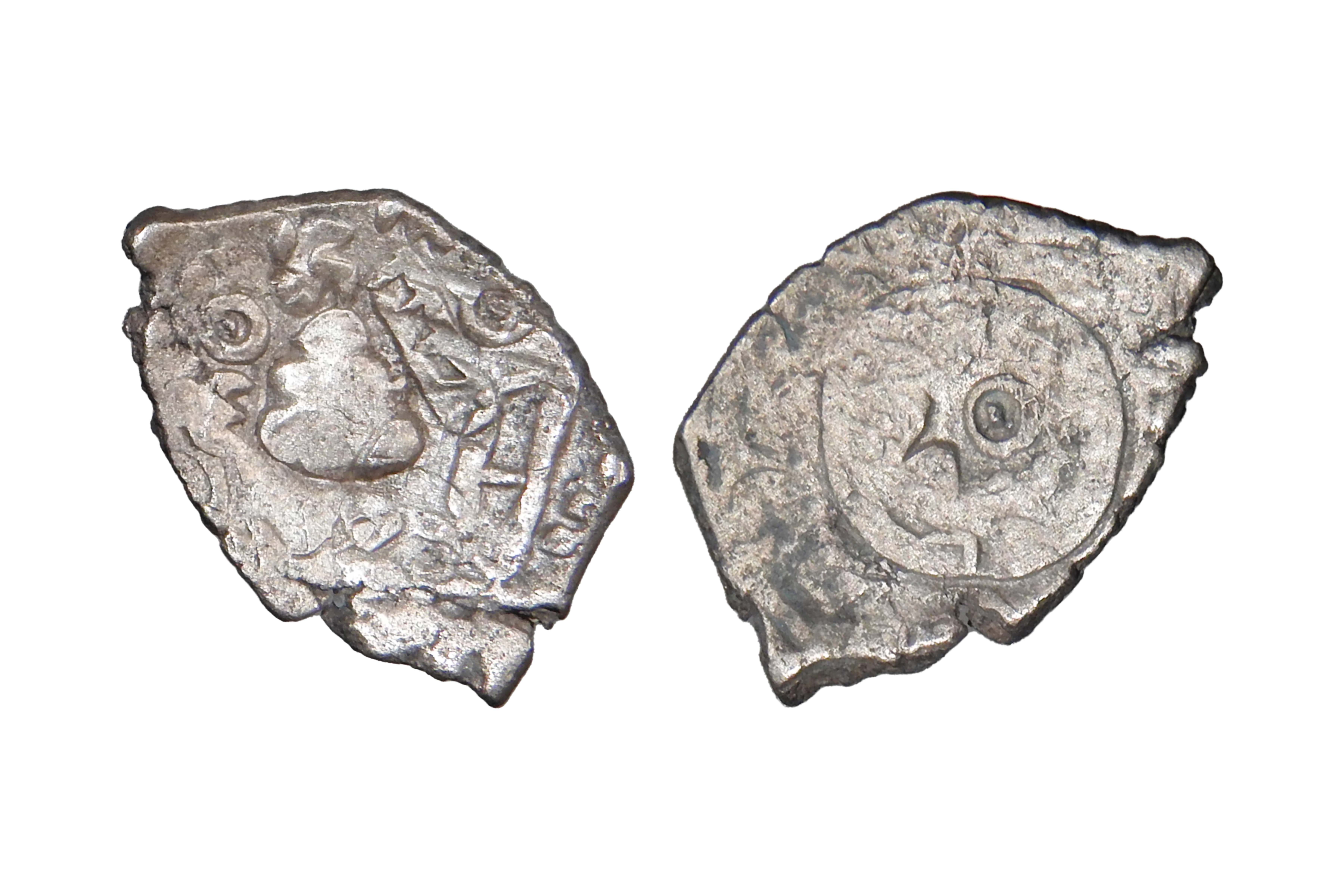 Kosala Janapadha (c.500-400 BC), Middle Ganga Region, Silver Vimshatika, 3.20 grms, ABCD Type, Symbols- 1x circle with 3 "S" symbols, 1x Star, 1x Double crescent facing 2 sides, 1x pole with a bud shaped symbol with a covering, Terry Hardakar Series II, KO#21, Several beautiful counter marks on reverse and a better specimen than the reference catalogue, Very Rare type and condition