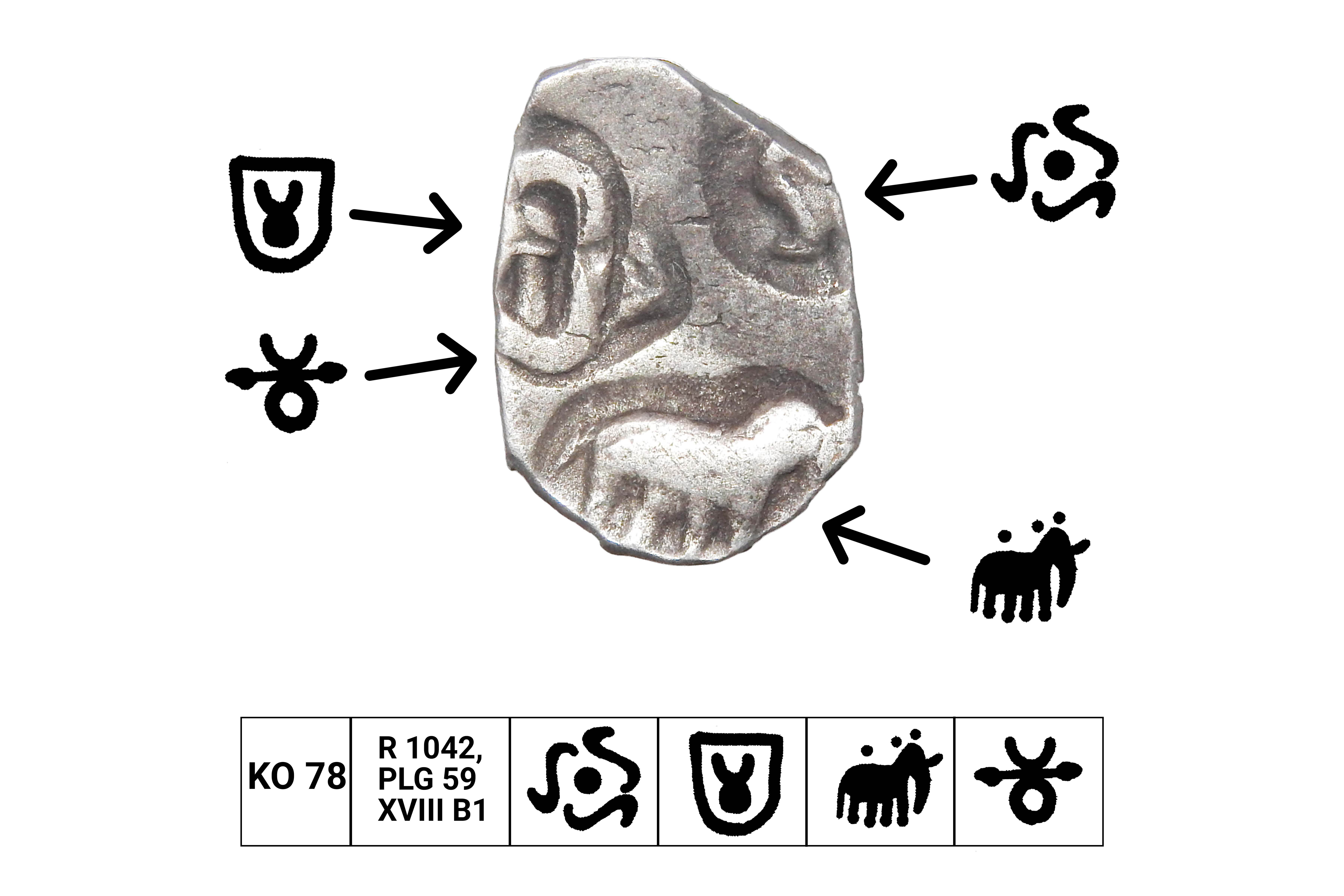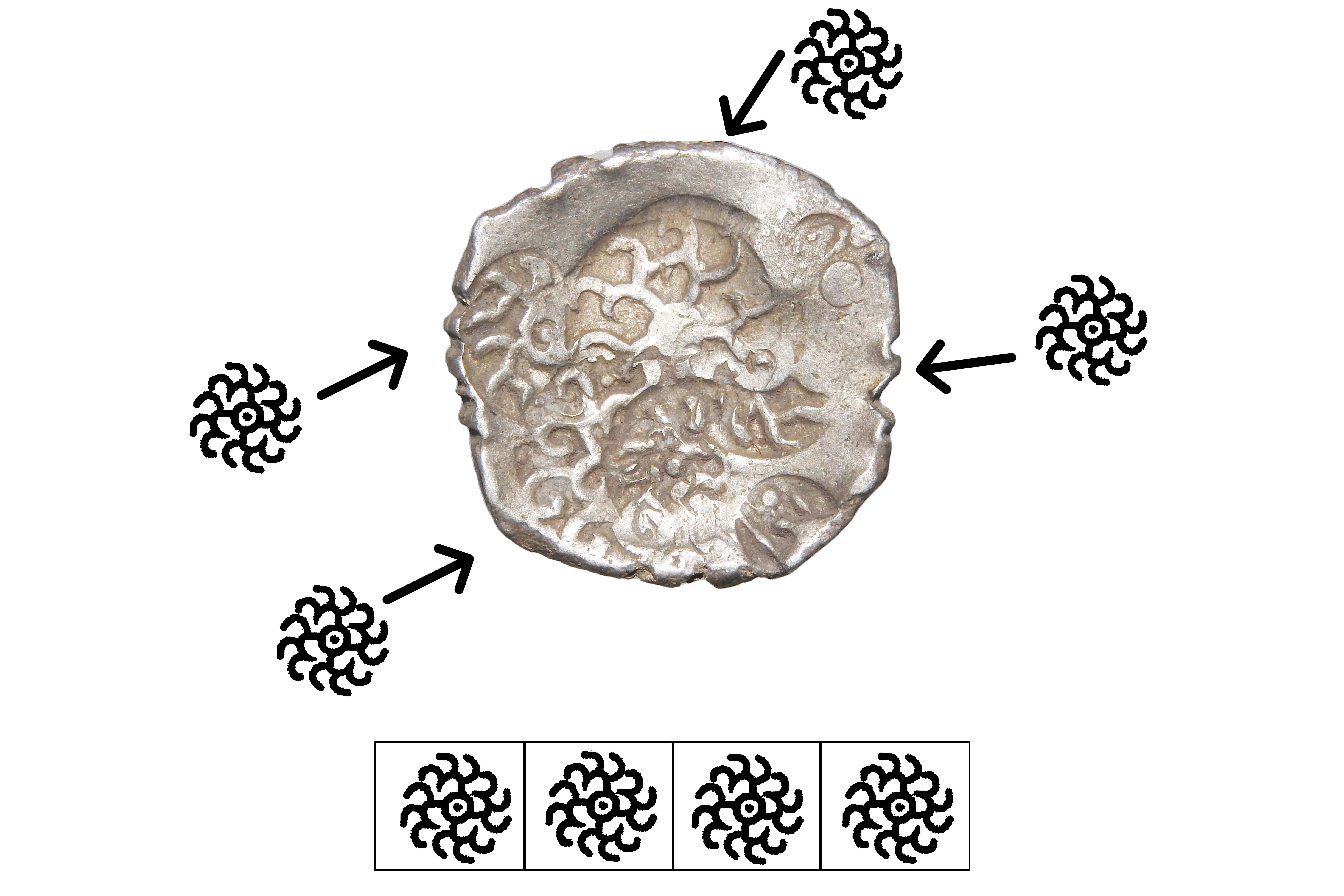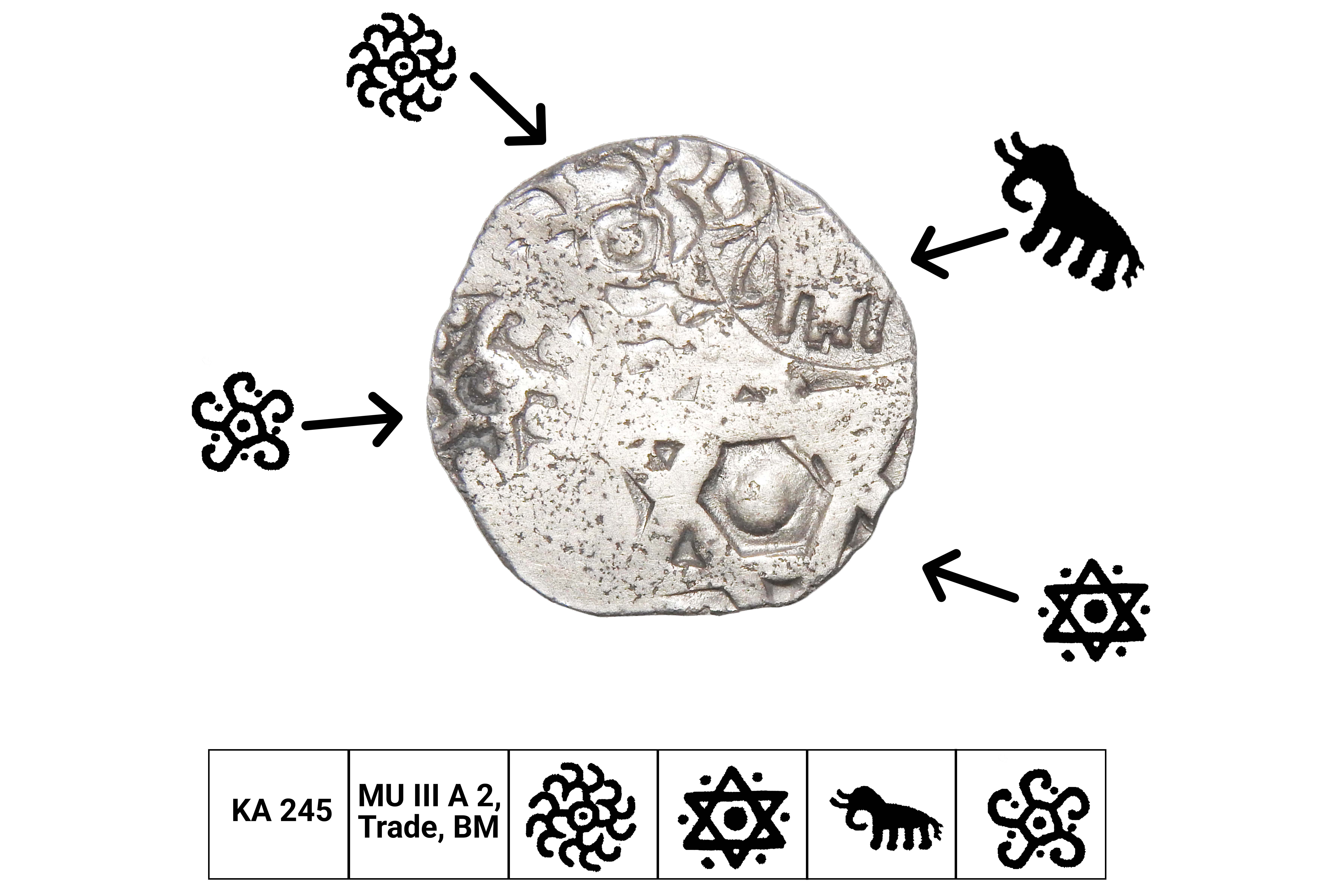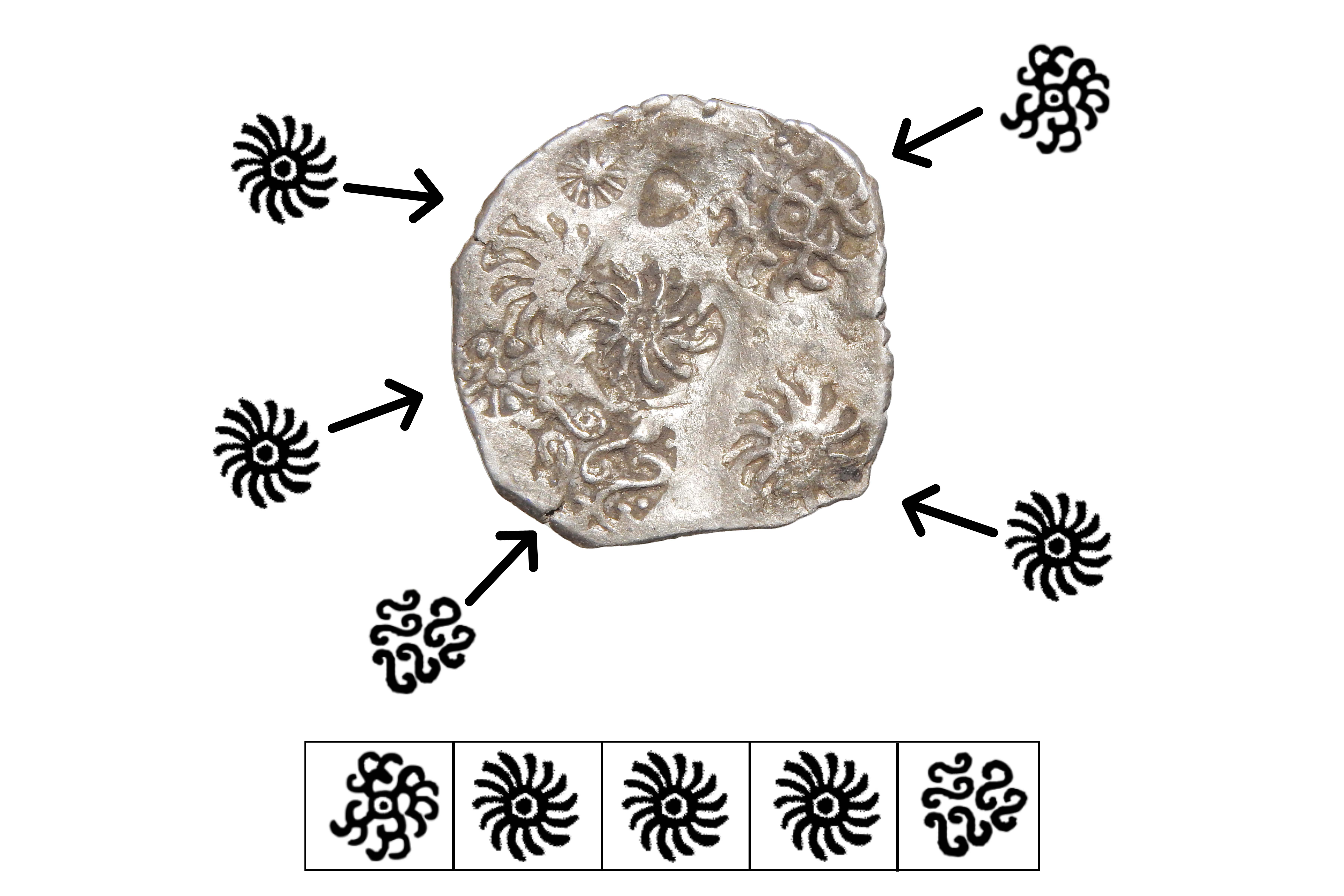 Kosala Janapadha (c.500-400 BC), Middle Ganga Region, Silver Vimshatika, 2.60 grms, ABCD Type, Symbols- 1x circle with 3 "S" symbols, 1x Taurine within a shield, 1x Elephant facing right, 1x Taurine symbol with double pointed arrow in the centre, Terry Hardakar Series IV, KO#78, B&D symbols overlapping, Very Scarce