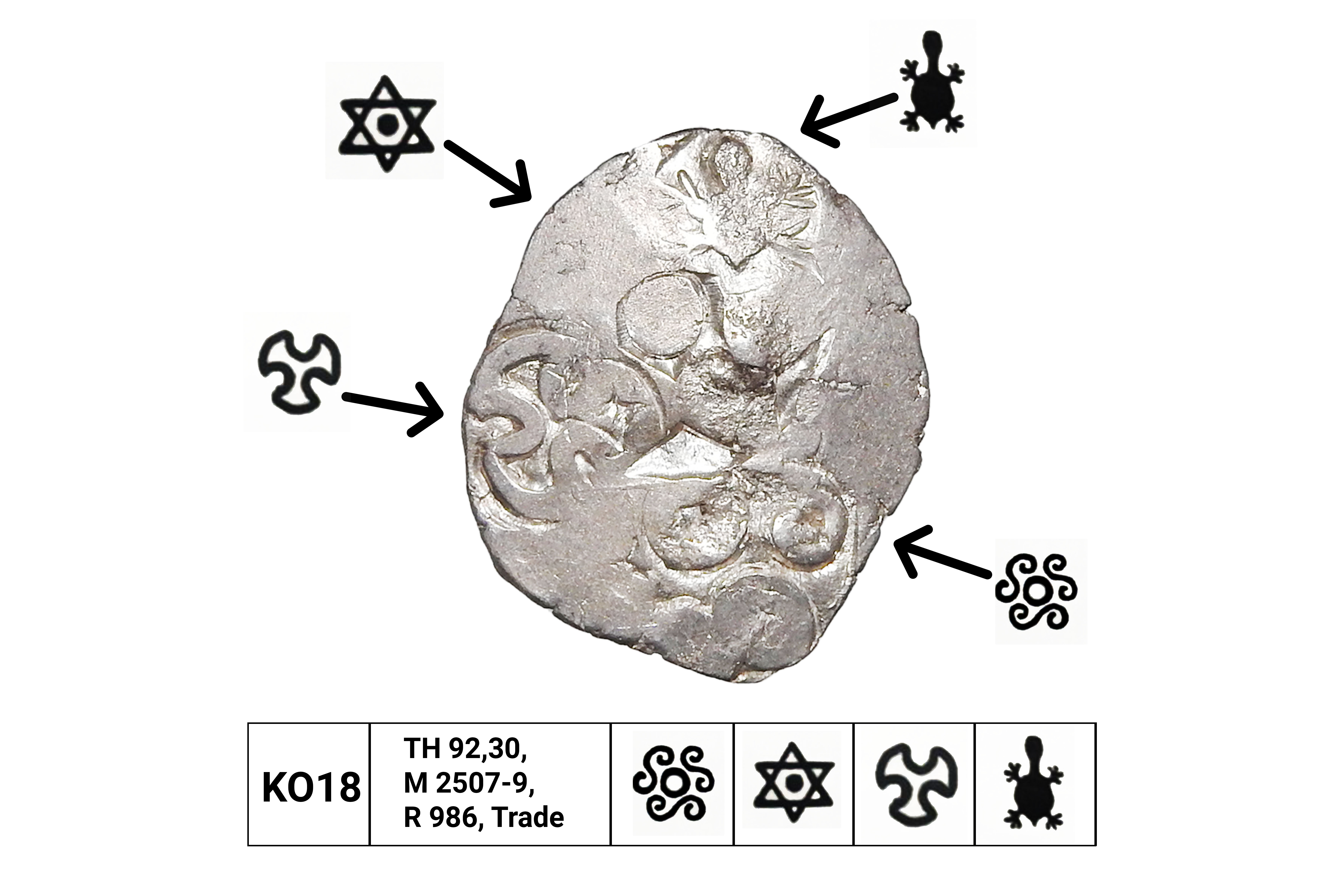 Kosala Janapadha (c.500-400 BC), Middle Ganga Region, Silver Vimshatika, 3.20 grms, ABCD Type, Symbols- 1x circle with 3 "S" symbols, 1x Star, 1x Shied like symbol, 1x Tortoise, Terry Hardakar Series II, KO#18, Several counter marks on reverse but a better specimen than the reference catalogue, Very Rare type and condition
